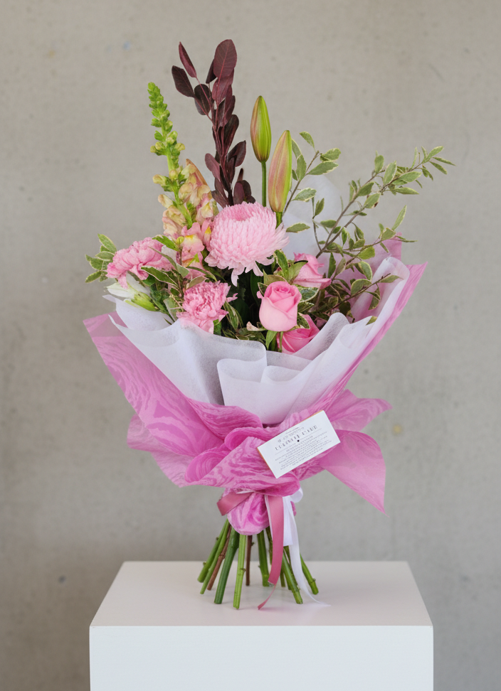 A gentle composition of all pink blooms, thoughtfully gathered to express tenderness, affection and romance.  Seasonal green foliage compliments this pink arrangement.