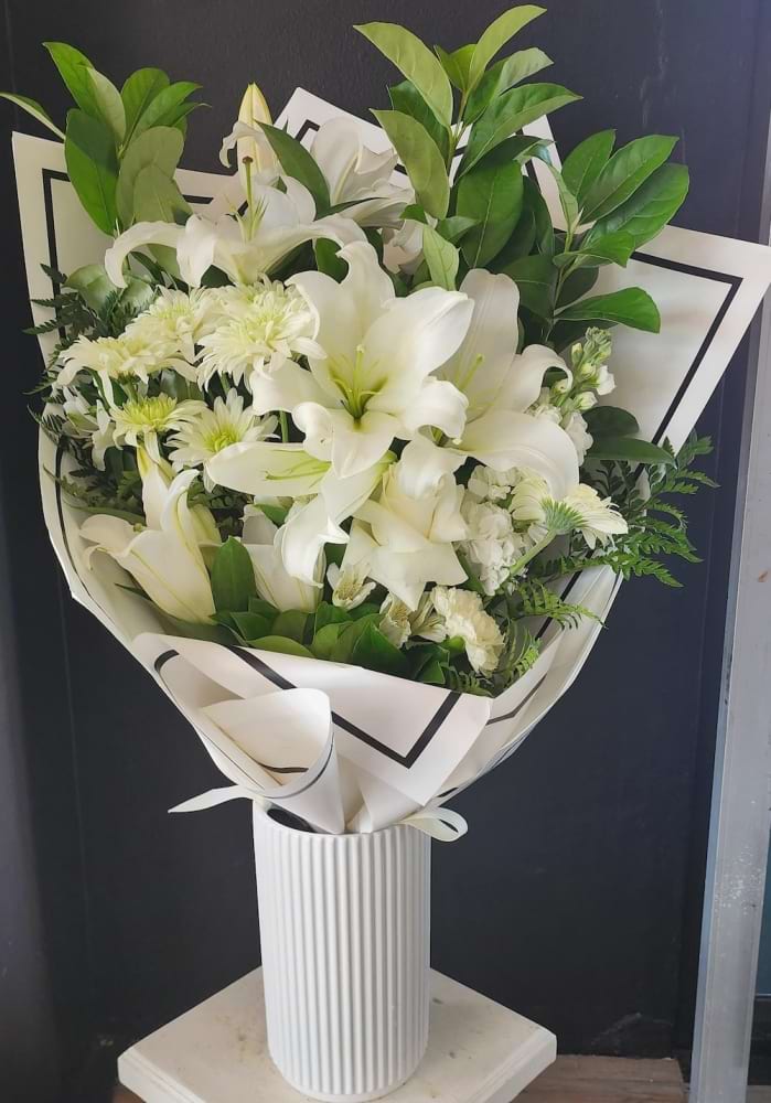 Sending the Serenity floral bouquet is a heartfelt way to honor the memory of a dearly departed family member, friend, or work colleague. These elegant white blooms symbolize peace, purity, and respect, providing a serene and beautiful tribute to their life. May this bouquet serve as a reminder of the cherished moments we shared and the lasting impact they had on all our lives. Though they are no longer with us, their memory will forever bloom in our hearts.
