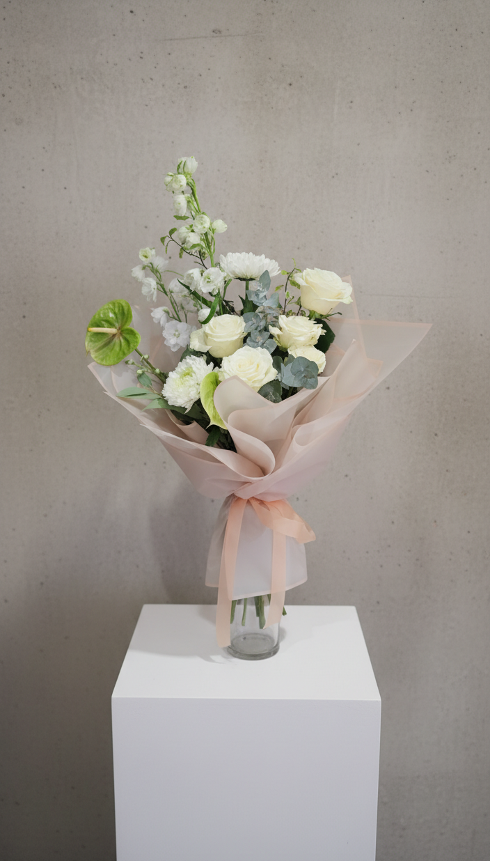 A graceful expression of everlasting love, Timeless in White is where elegance meets emotion. This all-white arrangement features premium white roses, airy delphiniums, plush chrysanthemum disbuds, and sculptural green anthuriums — a sophisticated blend of texture, tone, and purity.