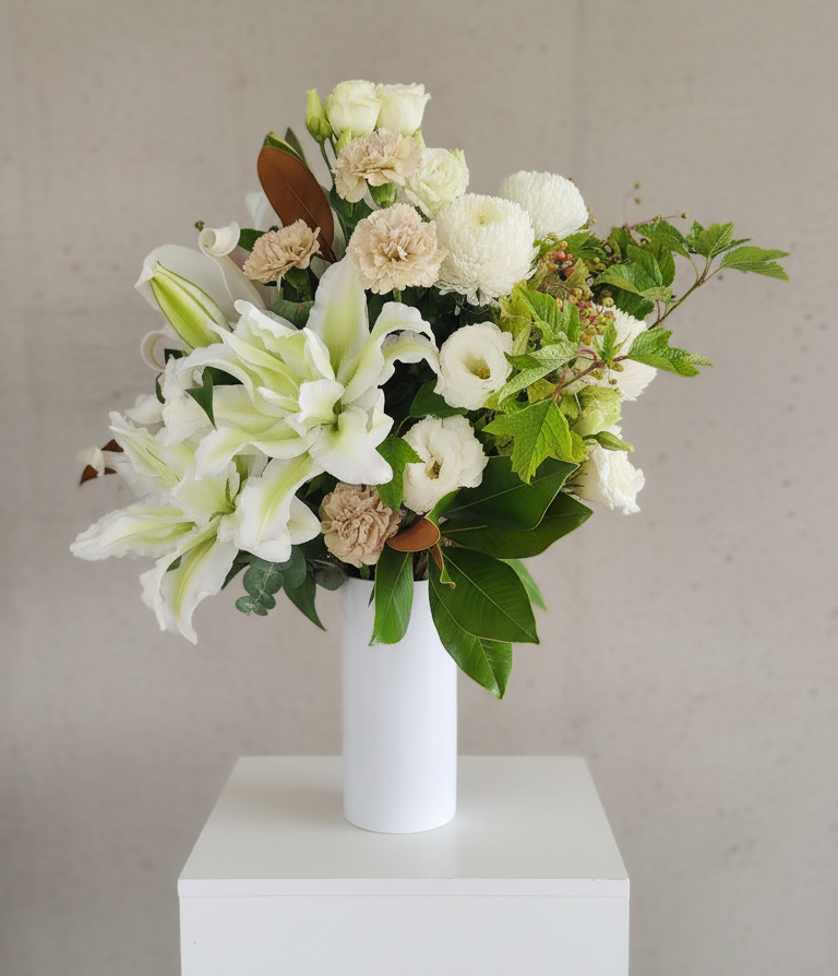 A classic white and mocha arrangement featuring Lilies, Carnations, Disbuds and Lisianthus with season green foliage. Tall white ceramic vase included.