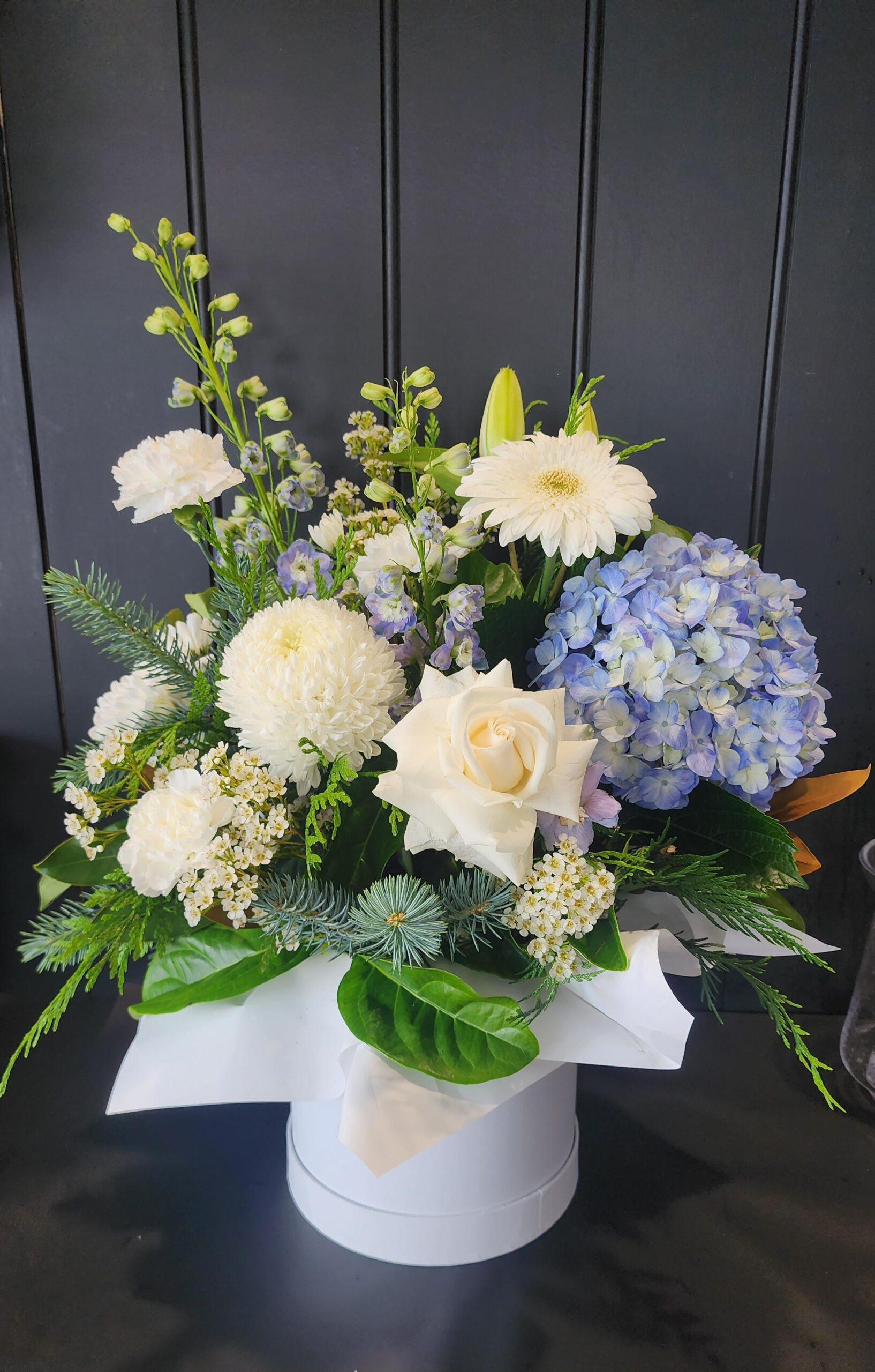 A gorgeous arrangement of white ranunculus and white chrysanthemums complimented perfectly with dusty miller and eucalyptus leaves to welcome a new baby. Can be substituted for alternative colour.